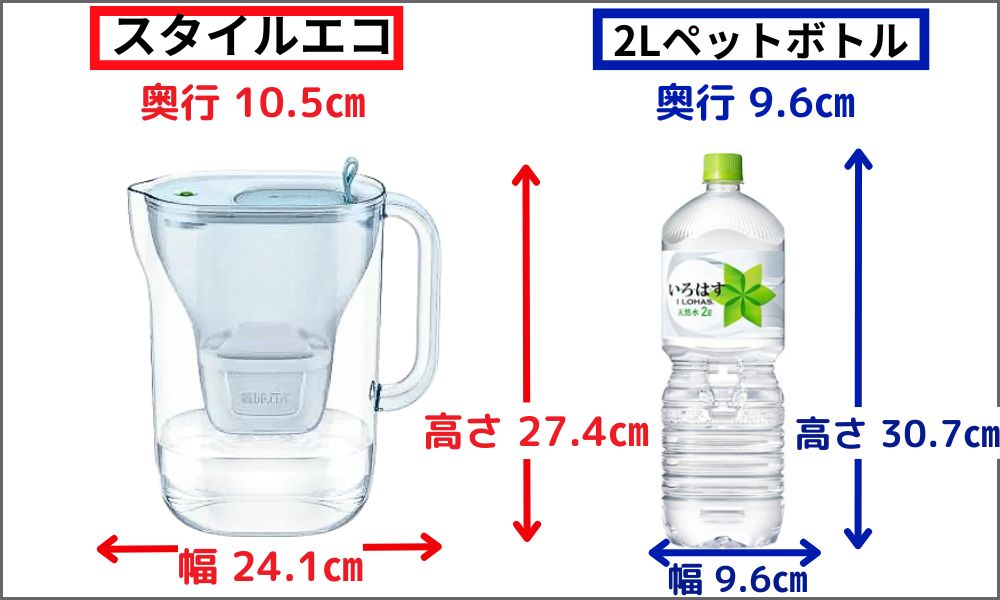 サイズは2リットルのペットボトルとほぼ同じサイズで冷蔵庫のポケットにもスッと入ります。