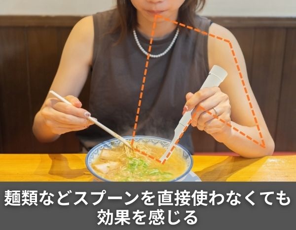 • 仕組み上の制約: 微弱な電流を流すためには、スプーンの持ち手にある電極部分に指が触れ、食べる人の体を通して電流が回る必要があります。