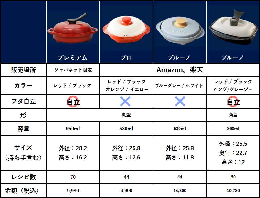 プロ、ブルーノは1~2人前、プレミアムやプログランデは2~3人前となっていますが、レンジメートで何を作ることが多いかで選んだ方がいいと思います。