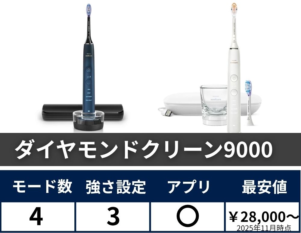 | ダイヤモンド クリーン 9000 | 4 | 3 | 〇 | 14日間 | 28,000円 前後 | 充電グラス アプリで毎日の歯磨き記録 |