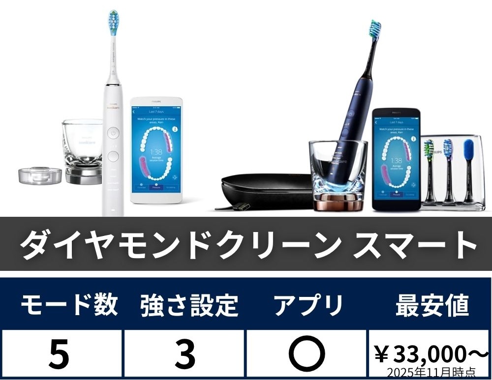 | ダイヤモンドクリーン スマート | 5 | 3 | ◎ | 14日間 | 33,000円 前後 | アプリでリアルタイム解析 ブラシ認識機能、充電グラス |