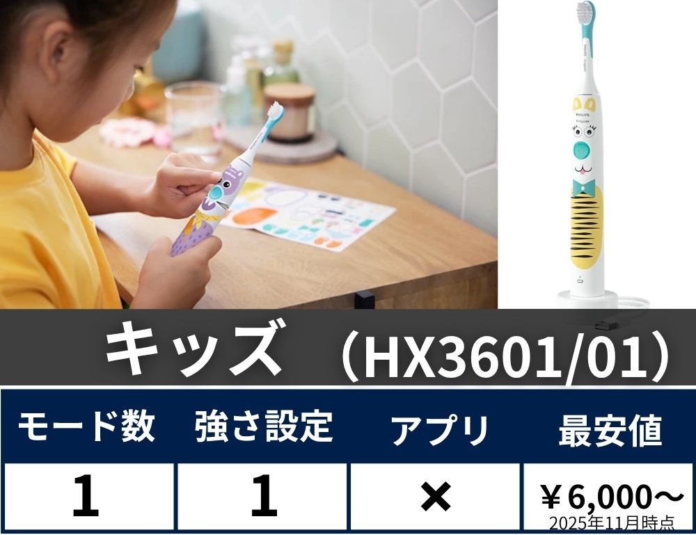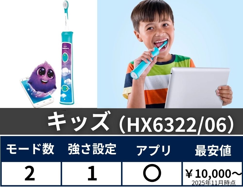 | キッズ (HX6322/06) | 2 | 1 | 〇 | 14日間 | 10,000円 前後 | 子供向けモデル。 アプリで歯磨き習慣を学習 |