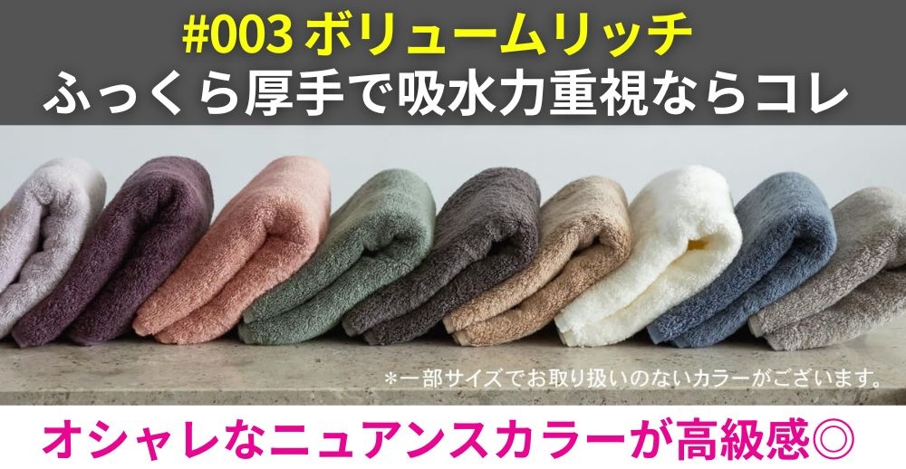 • #003「ボリュームリッチ」…定番の厚手シリーズ。ホテルタオルのようなリッチ感