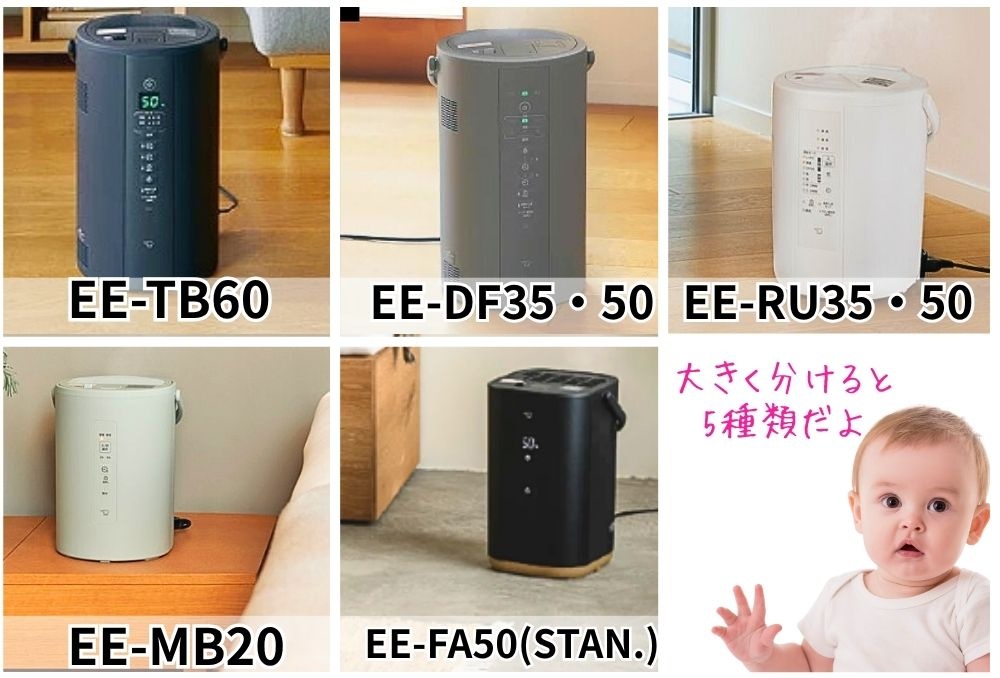 象印の最新加湿器は、EE-TB60、EE-DF35・50、EE-RU35・50、EE-MB20、EE-FA50(STAN.)と、用途や部屋の広さに合わせて選べる豊富なラインナップが魅力です。