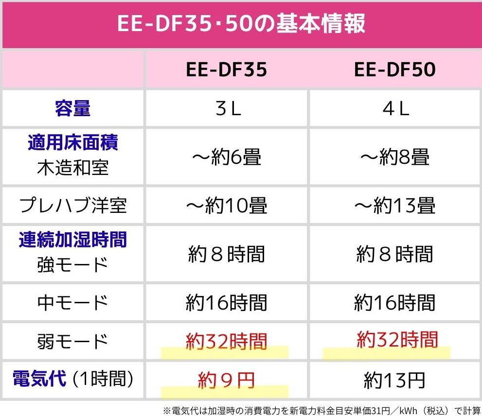 EE-DF35は3.0Lで寝室や子ども部屋、EE-DF50は4.0Lの容量で、4Lは広めの居室からリビングの広さに対応しています。