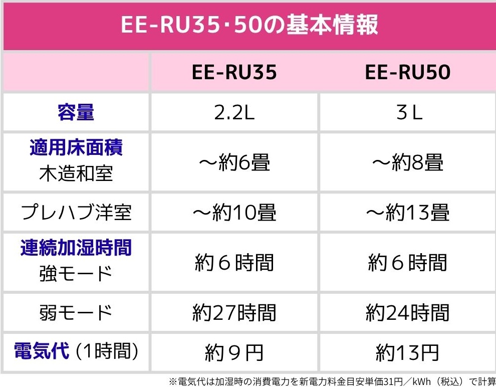 EE-RU35は3.0L、EE-RU50は4.0Lの容量で、EE-DFシリーズと同様の適用床面積をカバーします。