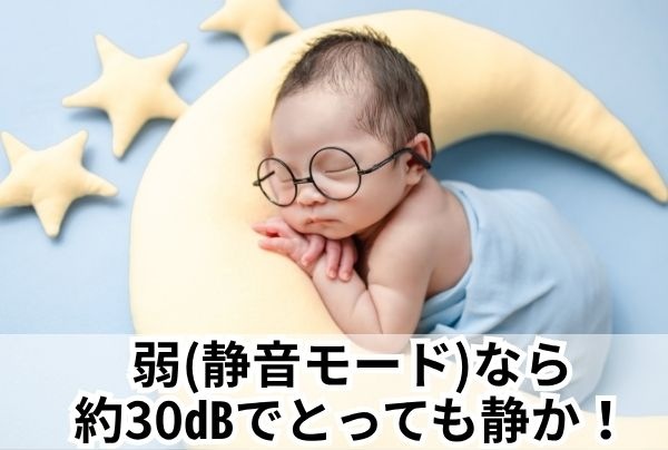静音モードであれば約30㏈。これは『ささやき音』と同じくらいでとても静かです。赤ちゃんがいる家庭でも安心して使うことができます。